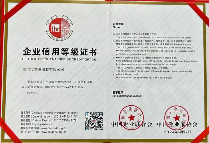 江门市龙腾服装有限公司获评AAA级信用企业,以诚信筑牢发展根基